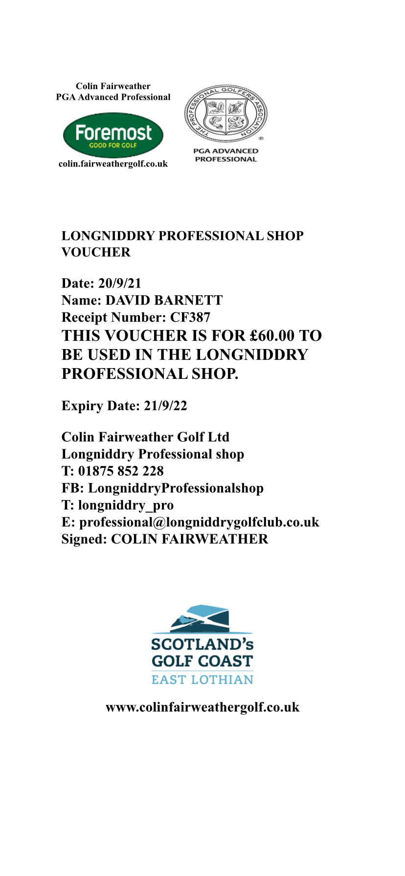Vouchers are Available at Longniddry Professional shop